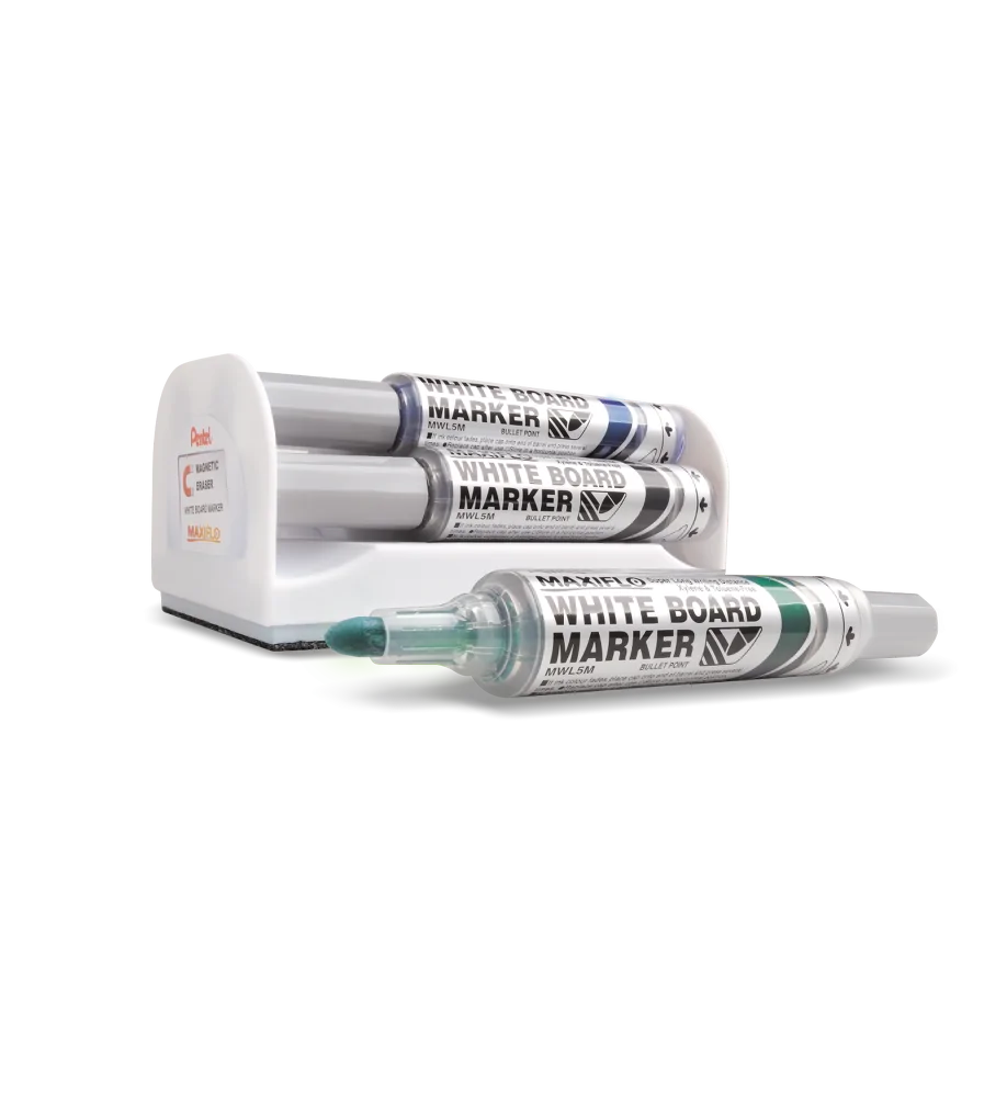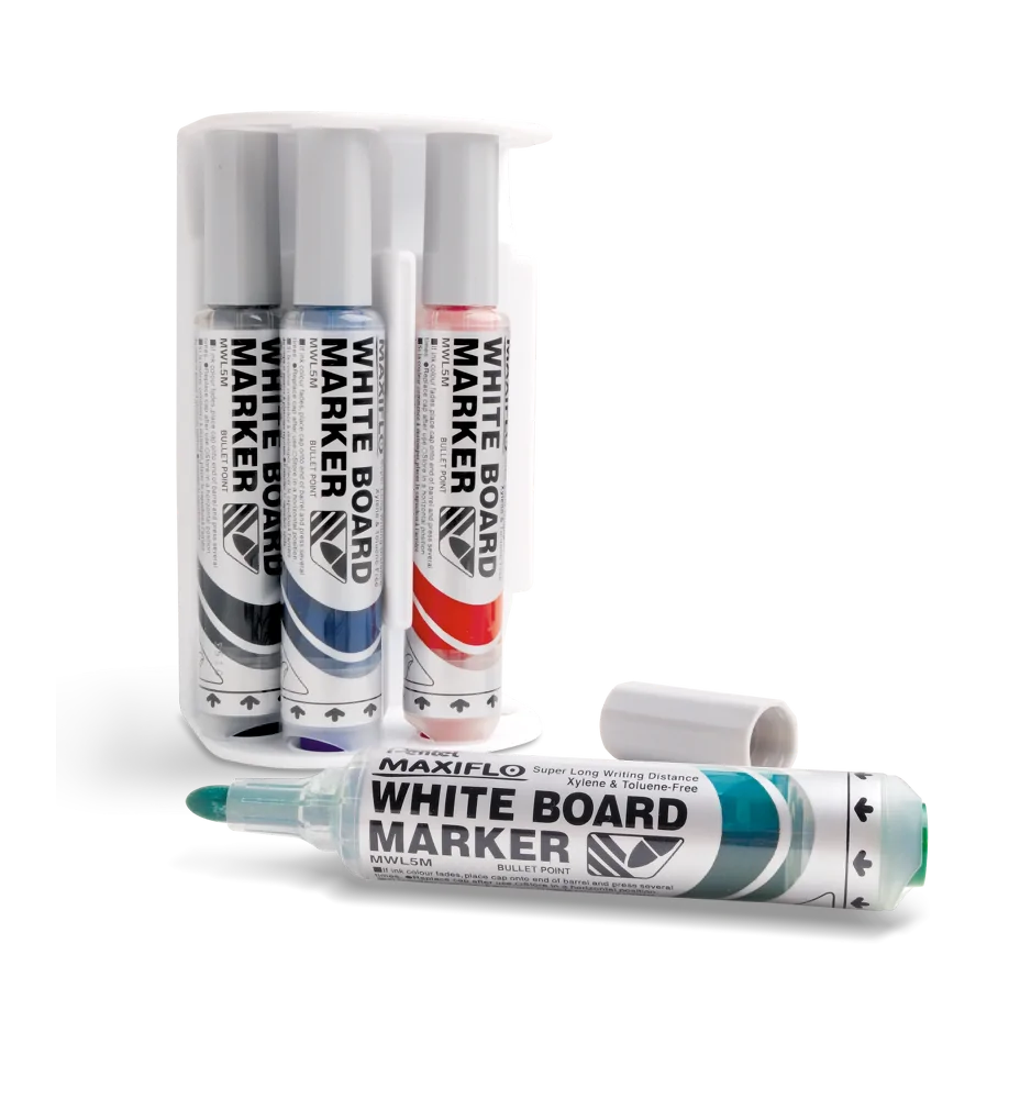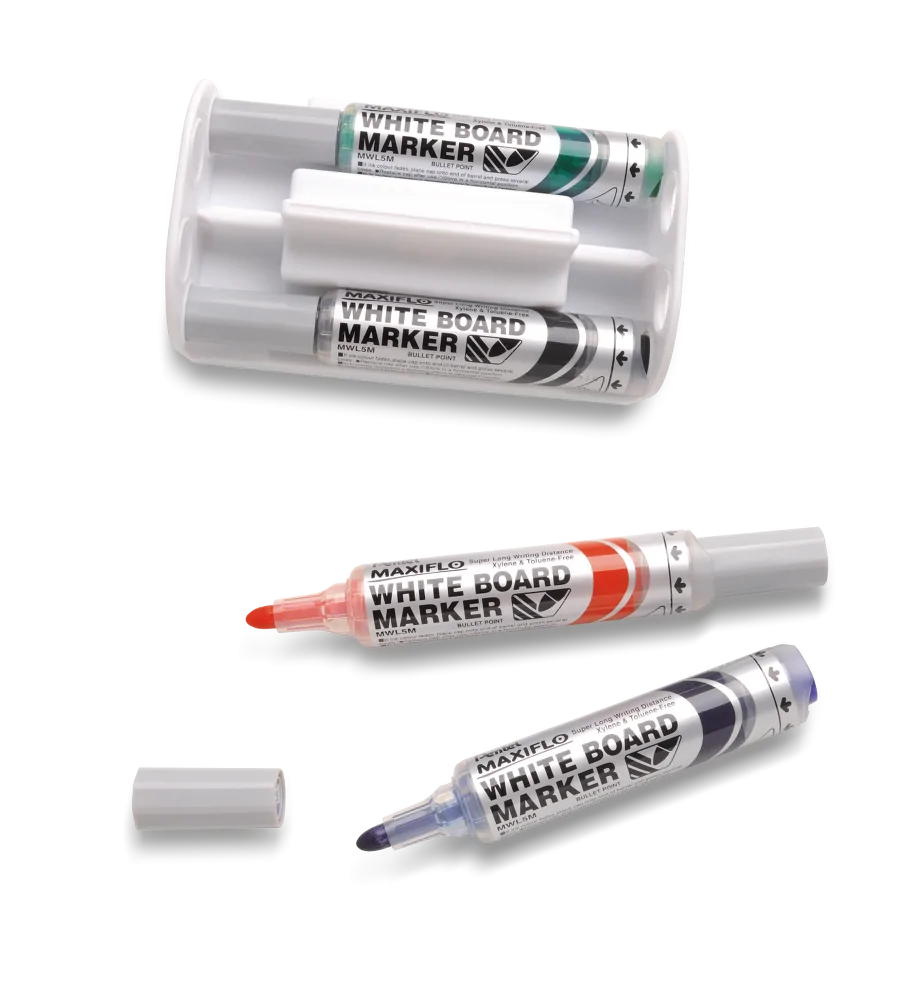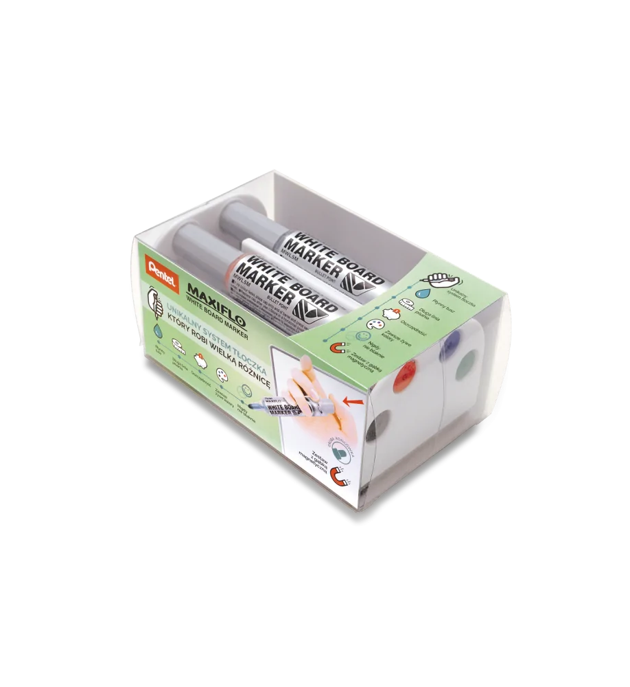 Zestaw 4 markerów MAXIFLO do białych i ceramicznych tablic. Płynny tusz dozowany w razie konieczności nawilżenia końcówki za pomocą tłoczka (zamiast tradycyjnego sączka). Marker pisze wyrazistą linią aż do ostatniej kropli tuszu. Kilkakrotnie dłuższa linii pisania niż w standardowych markerach z sączkiem - 1100 m. Nie zawiera substancji trujących ksylenu, toluenu ani polichlorku winylu. Nadaje się również na papier, plastik, karton. Wykonany w 50% z materiałów przetworzonych. Zestaw MWL5M-ST4ABCDPL / (MWL5M-4N) zawiera 4 markery (czarny, czerwony, niebieski, zielony) oraz magnetyczną gąbkę.