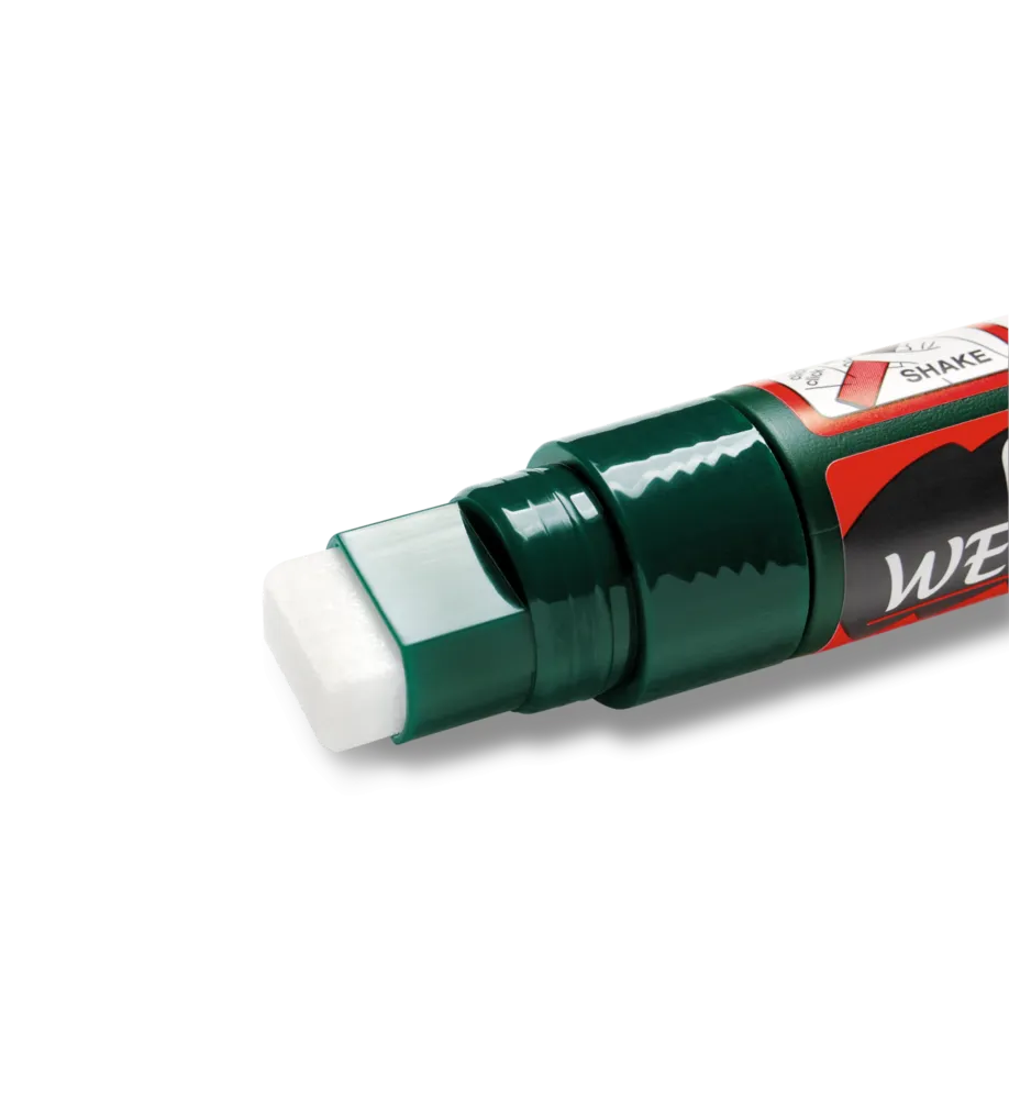 Marker kredowy z grubą końcówką. Produkt wybierany przez restauratorów (do ekspozycji menu), przedsiębiorców, właścicieli barów, sklepów i komisów samochodowych. Tusz po wyschnięciu jest odporny na lekkie opady deszczu. Idealny do wykonywania ozdób i dekoracji świątecznych na szkle i szybach. Dostępny w 8 kolorach tuszu: czarnym, czerwonym, niebieskim, zielonym, pomarańczowym, żółtym, fioletowym, białym.