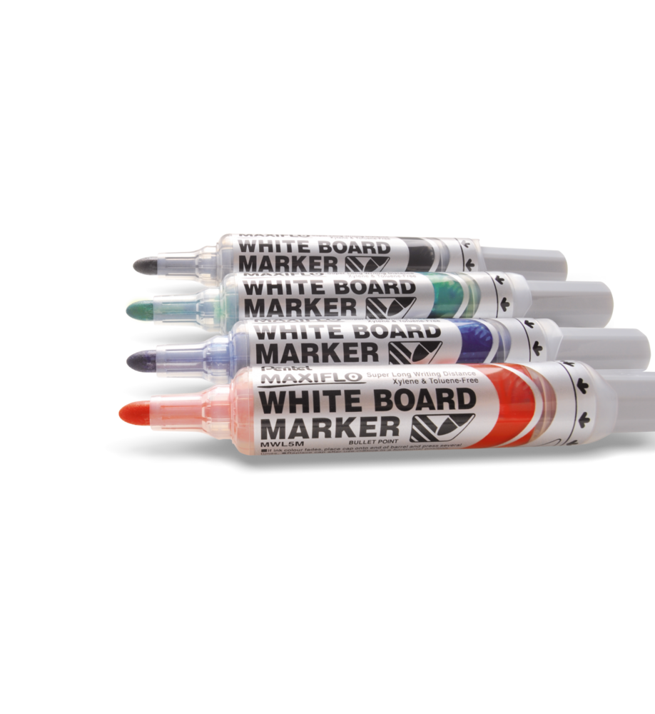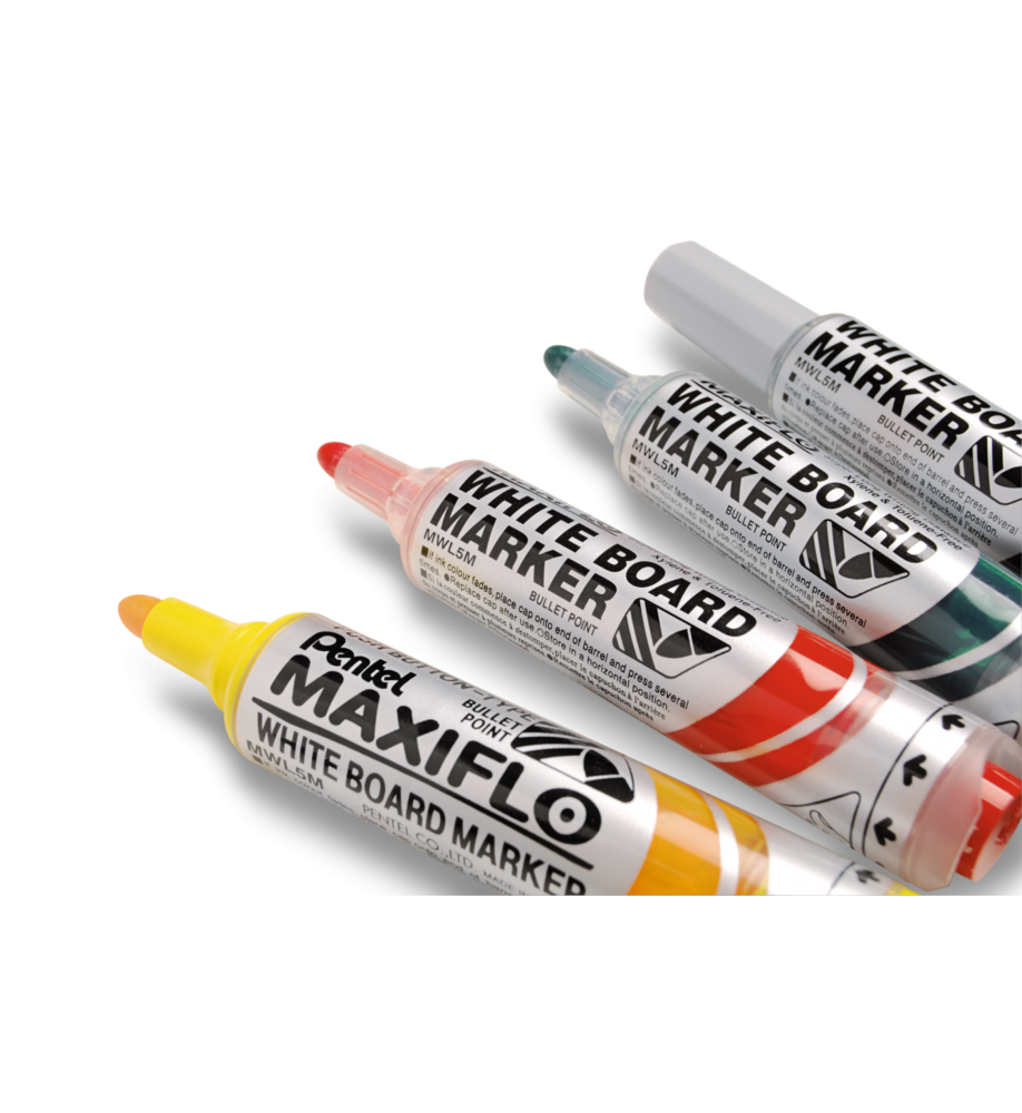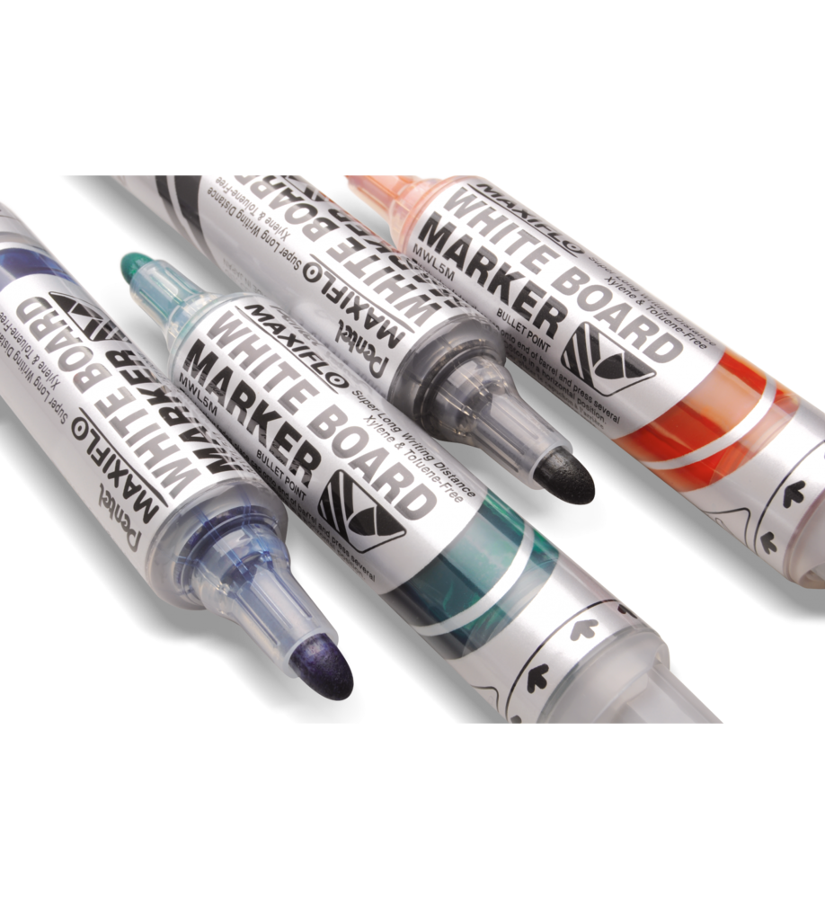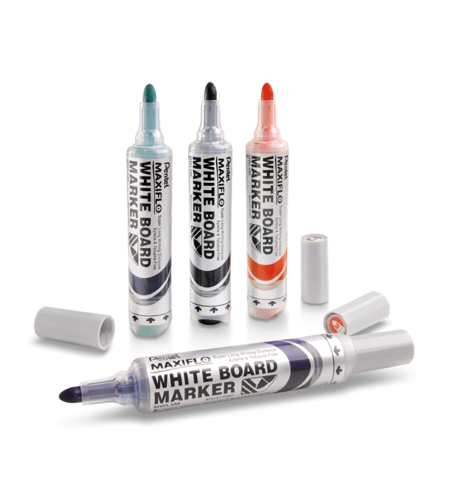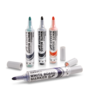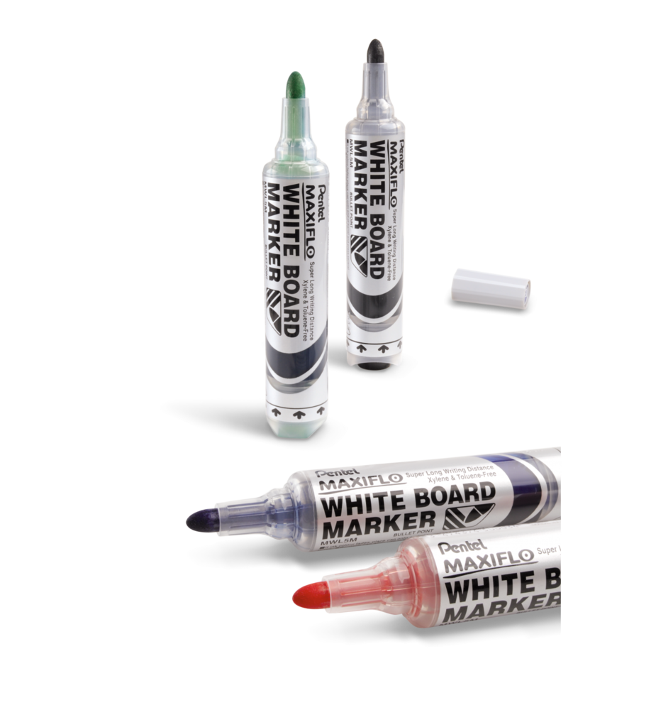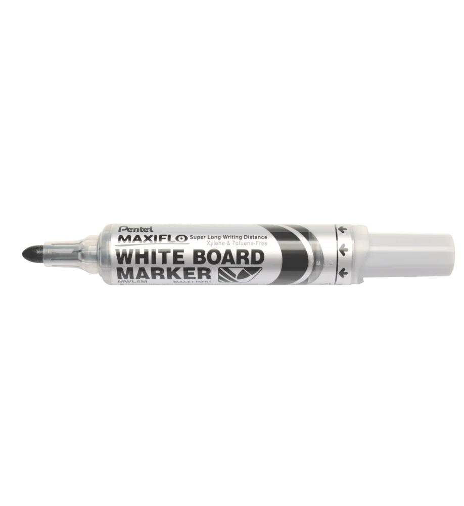 Marker MAXIFLO do białych i ceramicznych tablic. Płynny tusz dozowany w razie konieczności nawilżenia końcówki za pomocą tłoczka (zamiast tradycyjnego sączka). Marker pisze wyrazistą linią aż do ostatniej kropli tuszu. Kilkakrotnie dłuższa linii pisania niż w standardowych markerach z sączkiem - 1100 m. Nie zawiera substancji trujących ksylenu, toluenu ani polichlorku winylu. Nadaje się również na papier, plastik, karton. Wykonany w 50% z materiałów przetworzonych.