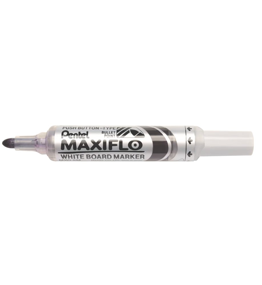 Marker MAXIFLO do białych i ceramicznych tablic. Płynny tusz dozowany w razie konieczności nawilżenia końcówki za pomocą tłoczka (zamiast tradycyjnego sączka). Marker pisze wyrazistą linią aż do ostatniej kropli tuszu. Kilkakrotnie dłuższa linii pisania niż w standardowych markerach z sączkiem - 1100 m. Nie zawiera substancji trujących ksylenu, toluenu ani polichlorku winylu. Nadaje się również na papier, plastik, karton. Wykonany w 50% z materiałów przetworzonych.