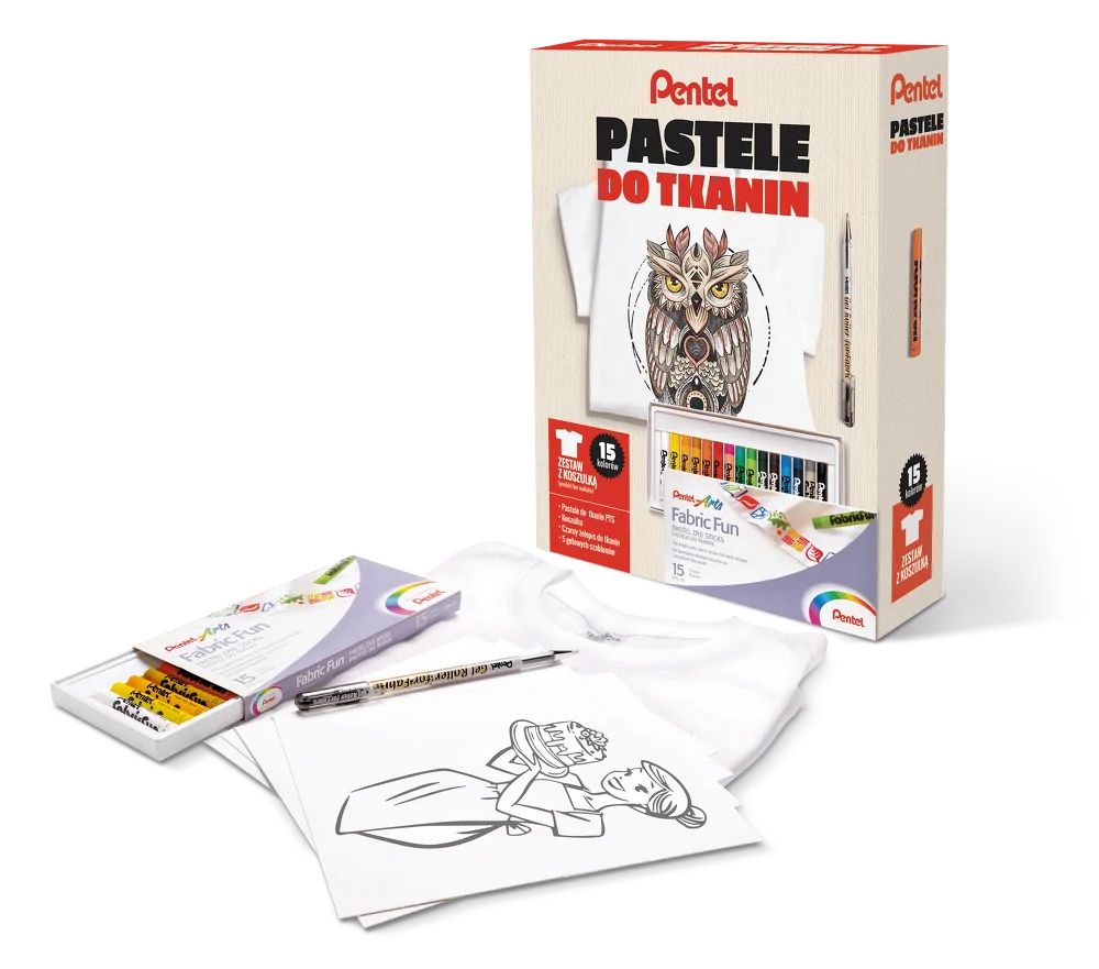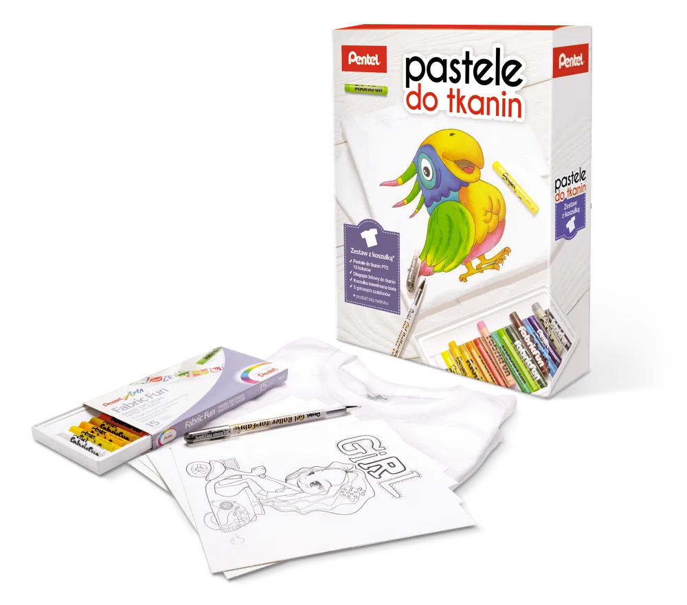 W zestawie: pastele do tkanin, długopis żelowy, koszulka