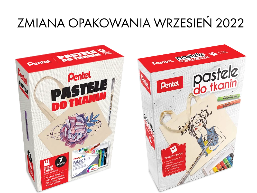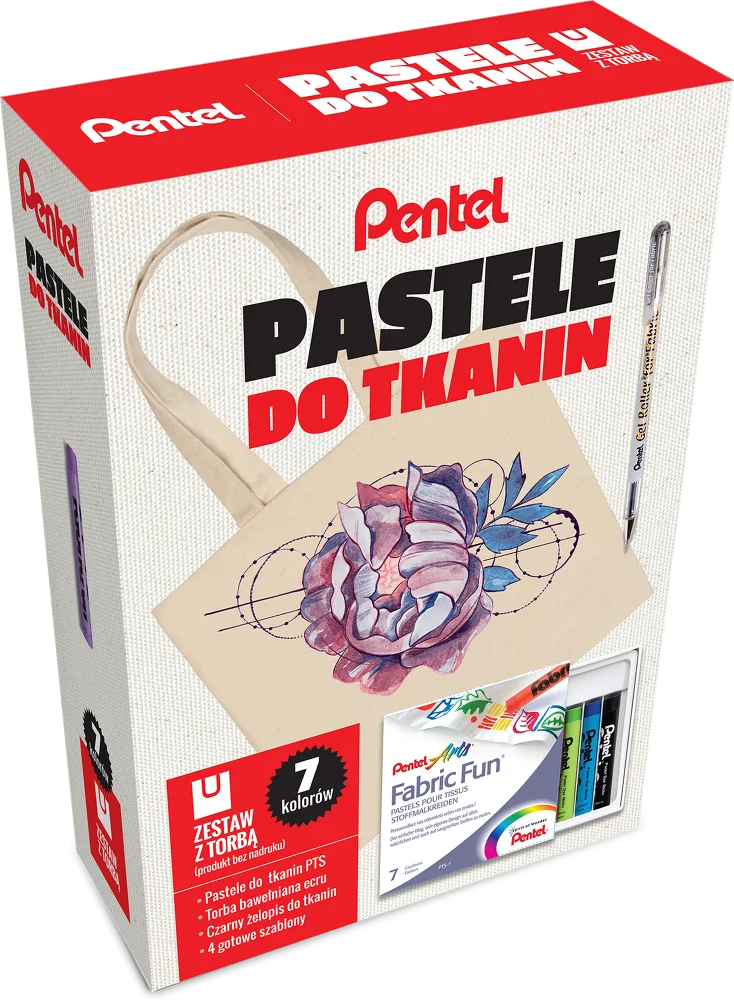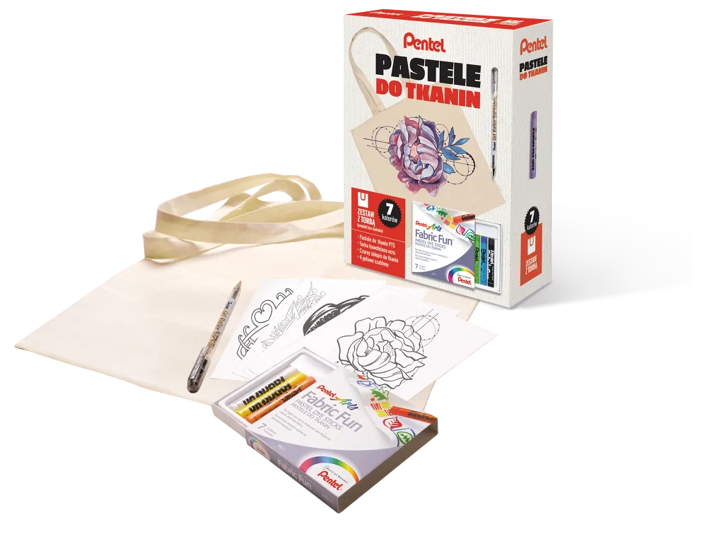 W zestawie: torba, pastele do tkanin, długopis żelowy