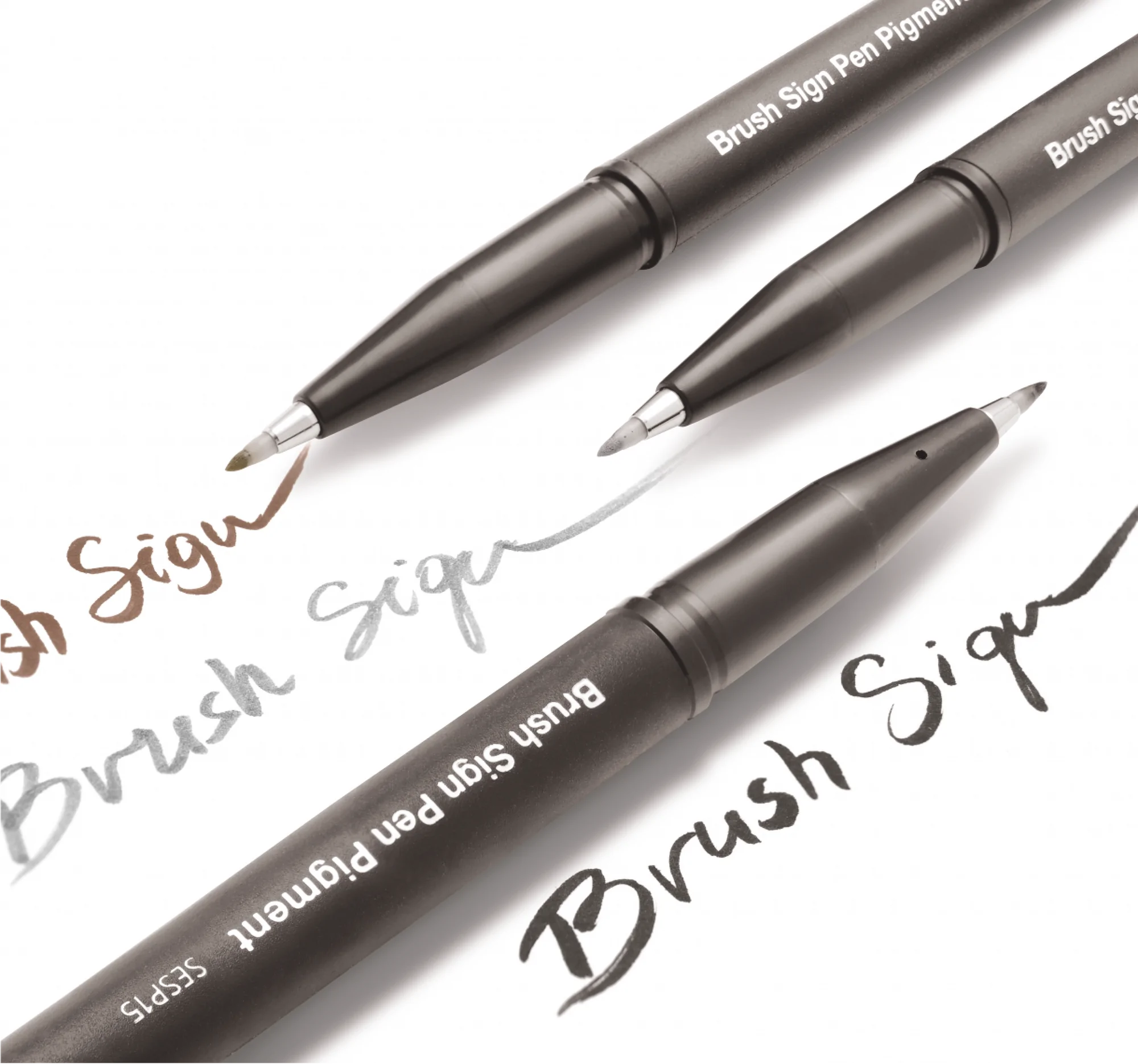Zestaw do liternictwa - Bush Sign Pen Pigment SESP15. Trzy pisaki pędzelkowe, z wodoodpornym tuszem pigmentowym w trzech atrakcyjnych kolorach: