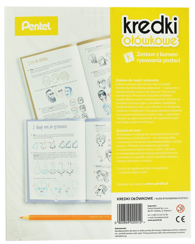 W zestawie bogato ilustrowany kurs rysowania postaci, kredki ołówkowe 24 kolory, ołówek i gumka. Kurs wyjaśnia i pokazuje, że rysowanie to sztuka, której można się nauczyć cierpliwie i dokładnie studiując kolejne kroki. Książeczka podzielona jest na 14 tematycznych rozdziałów: oczy, nos, uśmiech, twarz, głowa, uszy, włosy, emocje, ciało, ręce, nogi, tors i pośladki, ruch, ubranie. Z takim przygotowaniem i narzędziami – rysować każdy może!